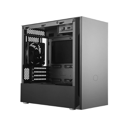 The Cooler Master Silencio S400 Mini Tower Case features a sleek black design with a steel side panel, ensuring both durability and a modern aesthetic. Designed for MicroATX and MiniITX